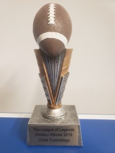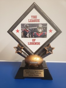 In 2018 the MVP award was introduced to the league, however, the MVP award will be replaced by the Coach of the Year award. Bill is our first winner of this prestigious award. Besides the championship trophy, the Coach of the Year award is the second toughest award to win. Bill led his Rugknuckles squad to a 10-3 record and scored over 1700 points. Rugknuckles was the only team to have double digits wins and score 1700 points on the year.