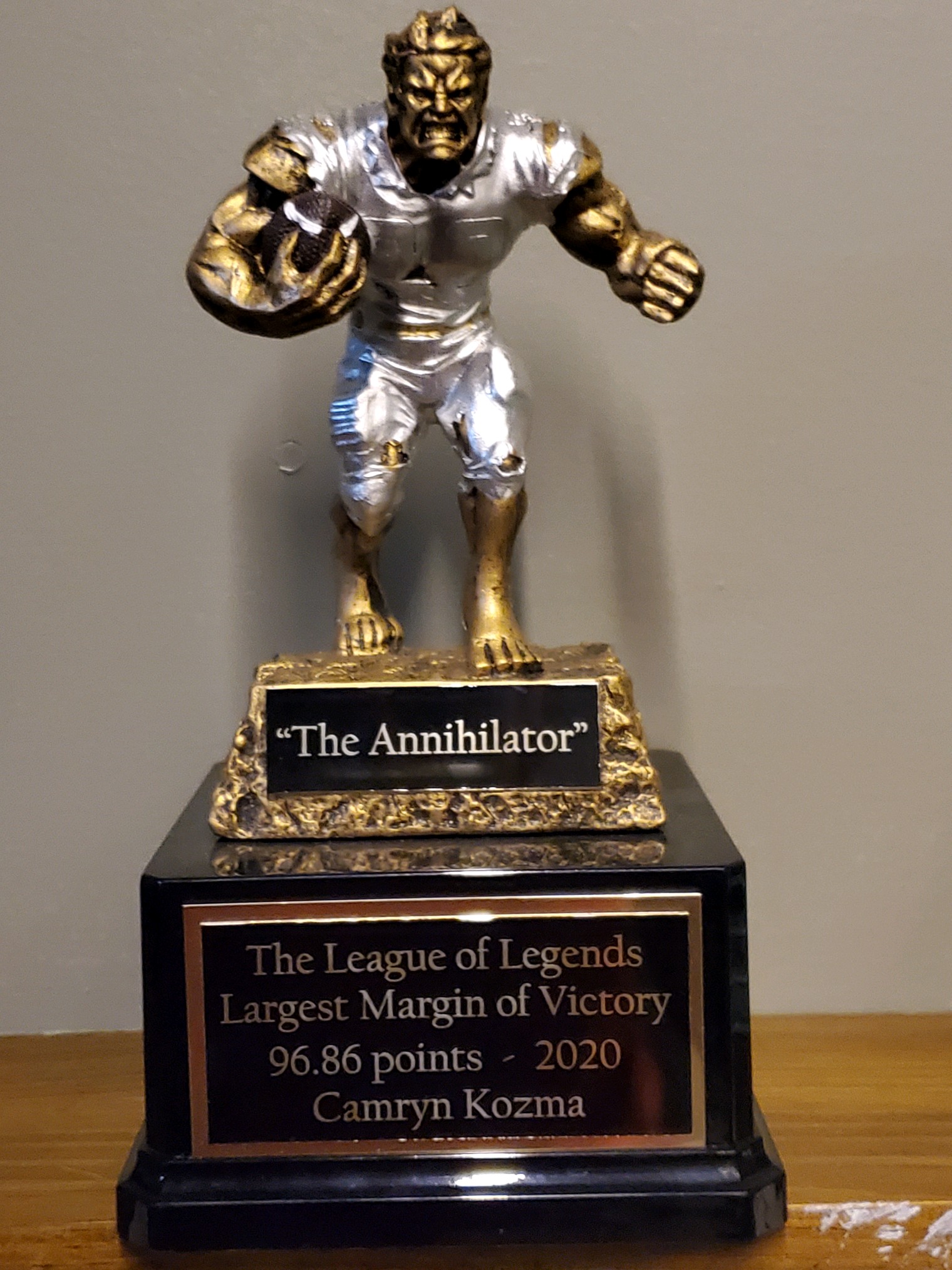 Do you remember the day you lost your virginity? Well for those of you who don’t it’s ok, you can live life through the rest of us. After Cam won his first regular season award, he wanted to get another taste but with an even bigger bite. In 2020, Cam brought home two regular season awards, The Turkey Stuffer and the Annihilator award. The Annihilator award is one of the best around, winning this award shows you have the ability to literally demolish your opponent, especially when you do it by over 95 points.